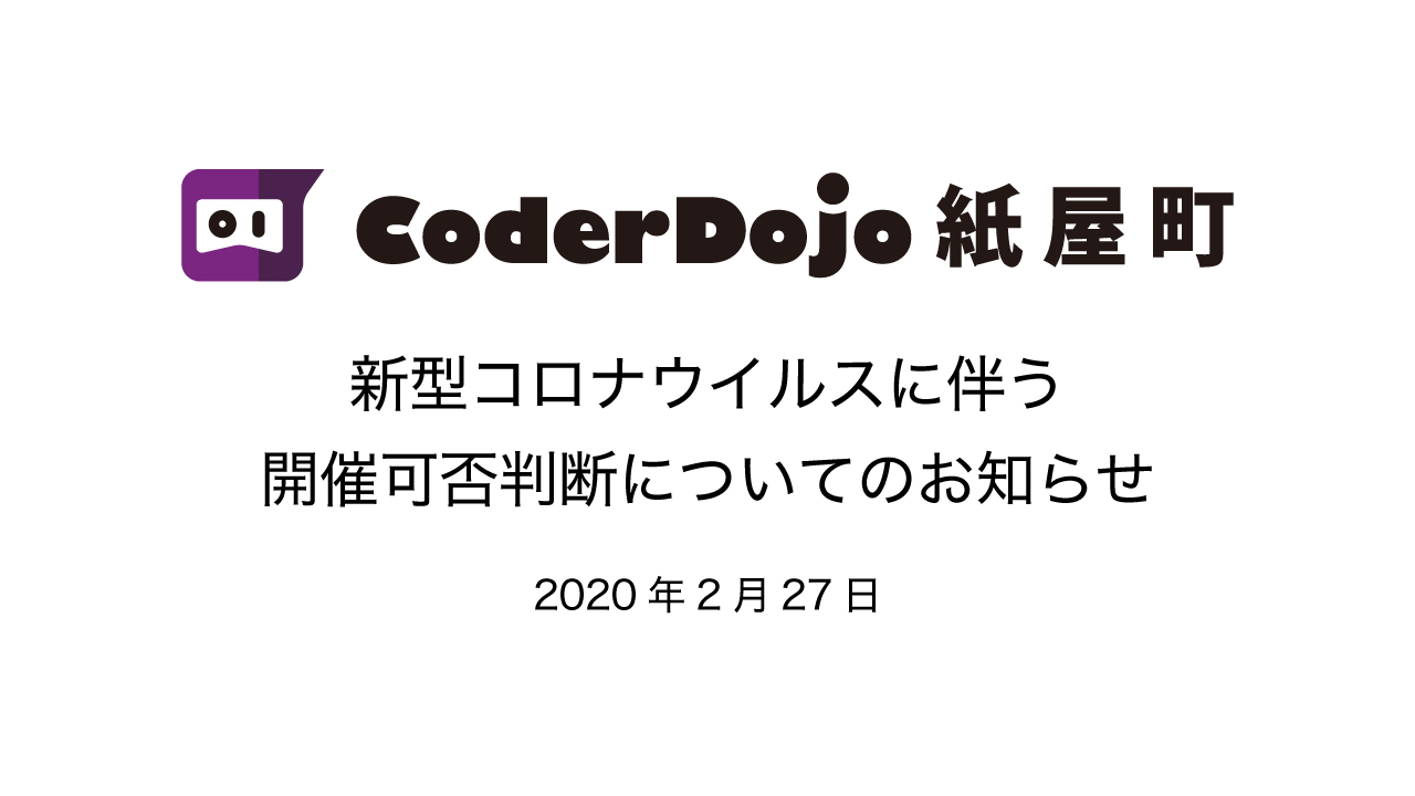 CoderDojo紙屋町(Camps会場、ProGym会場、ポートインク会場)では、新型コロナウイルスに伴う開催可否について、次の基準を設定し判断することにします。 開催中止の基準 新型コロナウイルスは、中国でも子どもが […]